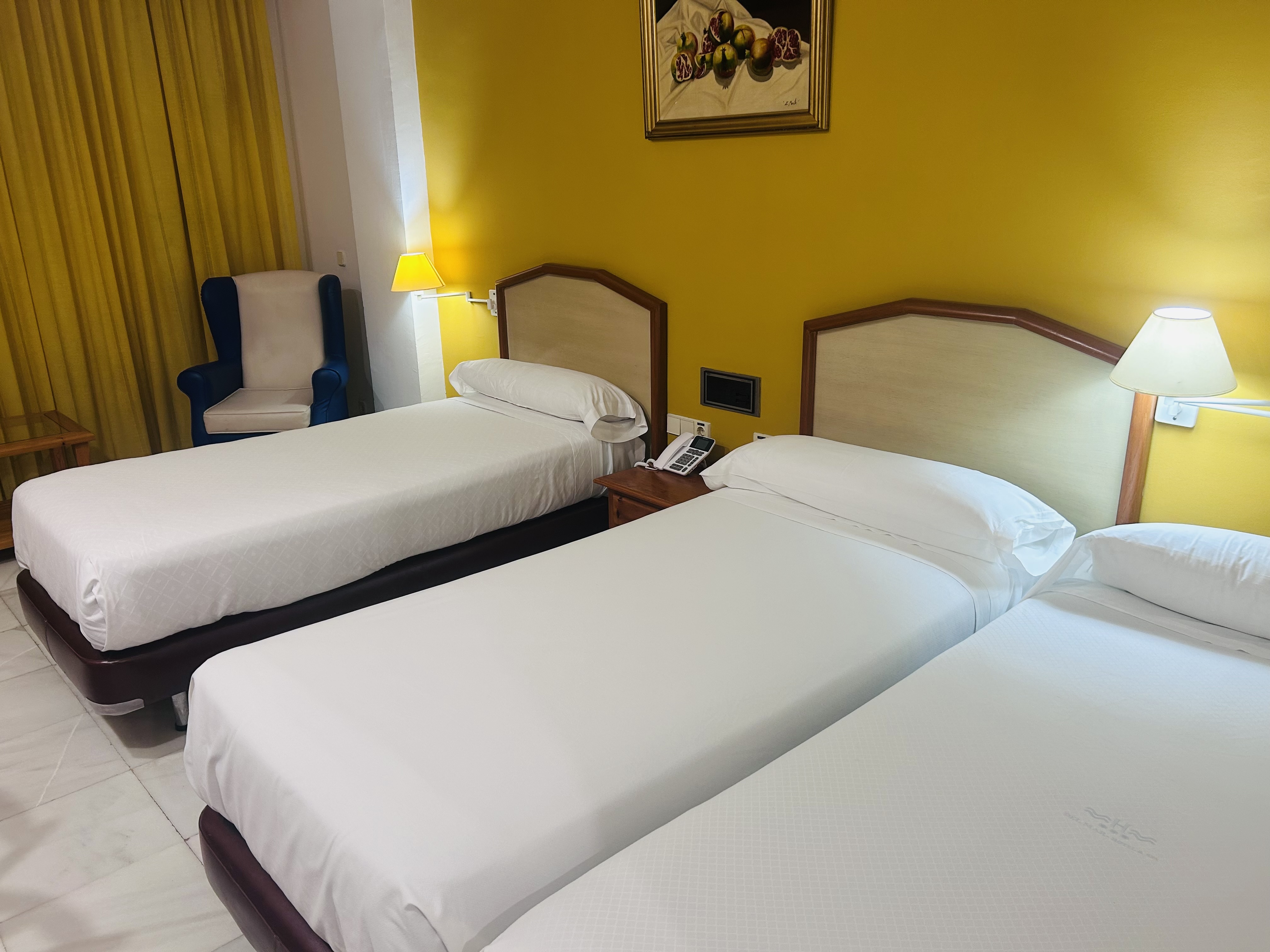 Disfruta de la amplitud en nuestra Habitación Triple con terraza en el Hotel Del Mar Spa. Un espacio diseñado para el confort compartido, destacando su terraza privada con vistas ideales para sentir la brisa de El Puerto de Santa María. Equipada con tres camas confortables (o cama doble + supletoria), aire acondicionado, Wi-Fi gratuito y baño completo. La luz de Cádiz inunda cada rincón, creando un ambiente cálido y relajante. El broche de oro a tu estancia tras un día de playa o una sesión en nuestro spa.